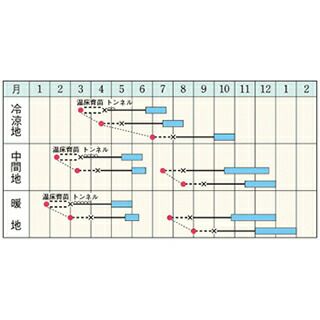 | | | 無仮植育苗では本葉2枚までに12cm間隔に間引きします。 仮植育苗では、本葉2~3枚時にポリポットに仮植します。夏まきでは寒冷紗等でトンネルにしてやることが大切です。 |