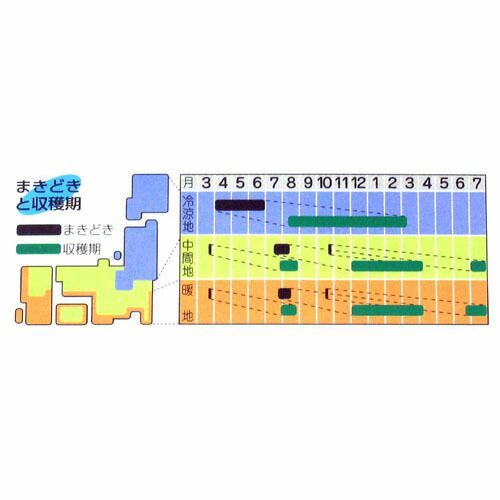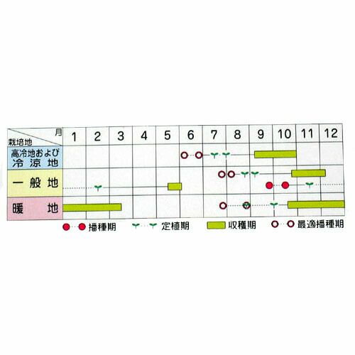 一般的には涼しい気候を好みますが、温度の適応範囲は広く、各作に適した品種も増えてきています。 夏まき栽培は早生から晩生の品種を使い分けることによって、初秋から冬にかけて収穫することができます。 秋にまいて翌春収穫する秋まき栽培は、品質が良く、結球もしっかりしたものが収穫できます。 春まき栽培では早まきほど育苗に加温や保湿が必要となり、また後半は気温が高くなるため、病虫害も多く発生するので注意が必要です。 いずれの場合においても極端な早まきや遅まきを避け、その地域に合った栽培時期を守りましょう。