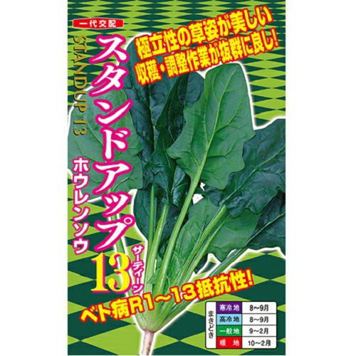 他の画像を見る ホウレンソウ 種 【 スタンドアップ13 】 Sテープ小袋 10m(5cm×3粒) ( ホウレンソウの種 ) ¥ 495 税込 ベト病R1~13まで欠け無しの抵抗性 カートに入れる お気に入りに登録する