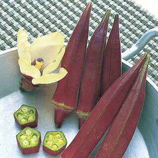 莢色が鮮やかな赤紫色の5角オクラ。小葉でスッキリした草姿をしており、莢の曲がりやイボ果の発生が少ない。料理の彩りには生で、普通の濃緑色オクラとして利用する場合は加熱する。