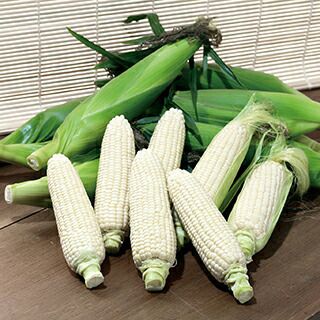 中早生ホワイト品種。熟期は84日で、非常にテリのよいパールホワイト。粒列もまっすぐで見た目がよい。また、包皮も濃緑で美しい。