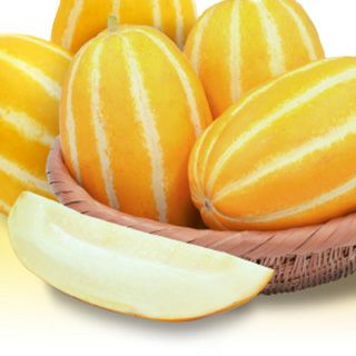 1.果皮が濃黄色で白い条斑が縦に入る、銀泉タイプの一代交配種です。2.草勢が強く生育強健で、諸病害にも比較的強い品種です。3.果重は500~700gと大きく、果肉の厚みが特長です。4.シャキッと歯ごたえのある肉質で糖度は14~15度になり大変食味に優れます。