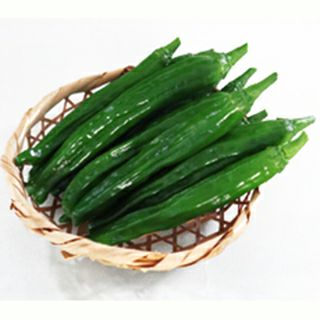 果実の長さは10~12 くらいになり縦しわの入る 鮮緑色の長型トウガラシです。長くても曲がりが 少ないのも特徴です。 辛味の発生がなく、歯切れの良いサクサクとした 食感で食味は良好です。炒め物や揚げ物など従来 の食べ方に加え、サラダにも適します。 草勢はやや強く、節間は長めとなります。生育中 期から後期にかけて収量が上るタイプです。 高温や湿害に強く、露地栽培にも適性があります。