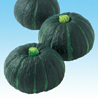 果実は濃緑色の地に灰緑色の条斑が入る、扁平形のミニカボチャで500g前後となる。