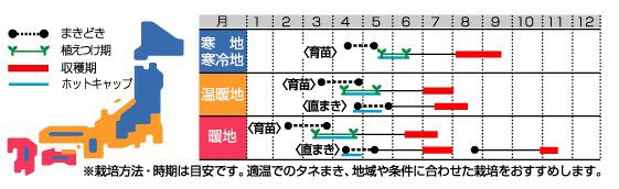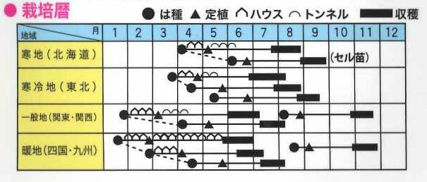箱まきをして、本葉1枚のとき鉢にあげます。4月以降ならポリ鉢に直接播いて簡単に育苗できます。行く病中は最低でも15~20℃の温度が必要です。本葉4~5枚の時に植え付けを行います。植えつけ間隔は100cmが目安です。