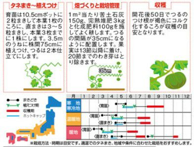 箱まきをして、本葉1枚のとき鉢にあげます。4月以降ならポリ鉢に直接播いて簡単に育苗できます。行く病中は最低でも15~20℃の温度が必要です。本葉4~5枚の時に植え付けを行います。植えつけ間隔は100cmが目安です。