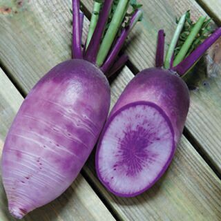円筒形で、肩部は濃く、根部はやや薄い紫色になり、内部も中心部から紫色に着色します。肉質は緻密で歯切れがよく、鮮やかな色みをいかしてサラダなどの生食、おろしや漬物に向く。根径 6~8cm 根長 16cm