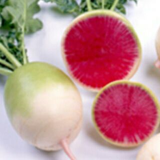 根の直径が7~8cm、内部の肉色は鮮紅色で美しく、サラダ、浅漬け、おろしに適します。紅色の成分はポリフェノールの一種「アントシアン」で、抗酸化作用があります。品種の特性上、内部紅色の発色程度に差が生じます。内部の発色が強い固体は、ひげ根も赤みを帯びます。
