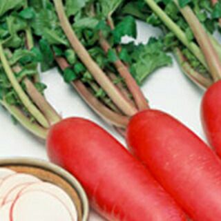 色鮮やかな赤ダイコンで、中は純白色でみずみずしく、サラダや酢漬けでおいしく食べられます。根は20~25cm程度になり、萎黄病に対して耐病性があります。