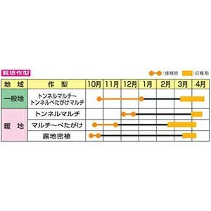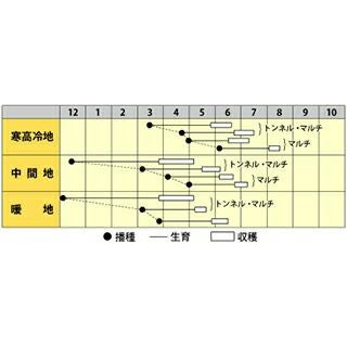 栽培時期によって異なりますが、秋どり栽培は60~70日、春どり栽培は10月まきで120~140日、3月まきで80~90日、夏どり栽培は60日位で根が肥大するので、太り次第収穫します。収穫が遅れると根がス入りになります。ス入りは葉柄のス入りと関係があるので、古い葉のつけ根から3cmぐらいのところを切断し、その中央部がス入りしているようなら、根もス入りしていると判断することができます。