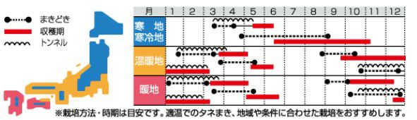 中間地 春まき:3月下旬~5月下旬、秋まき:8月下旬~10月中旬 春まき:1月下旬~3月中旬、秋まき:10月下旬~12月中旬