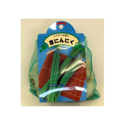畑で3~5日間乾かしたら葉の先端を切り取り、6~7球ぐらいずつ束ねます。風通しの良いところに吊るして保存をします。 |