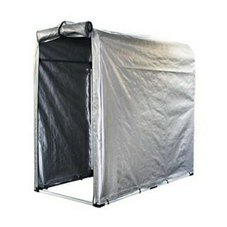 サイクルハウス。アルミフレームなので錆びに強く、軽くて丈夫です。付属のワンタッチゴムバンドを使えば、シートの固定も簡単にできます。