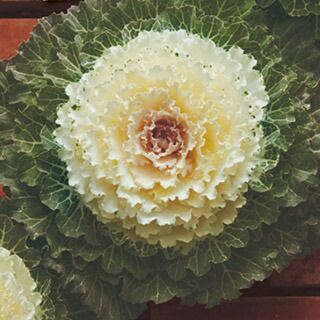 着色部が白色に染まり、外葉の濃緑色とのコントラストが美しい。プロも愛用する作りやすい葉牡丹です!