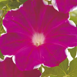 朝顔の中でもっとも大輪に改良された品種です。本葉が10数枚になるとつるが伸び、高温でよく生育します。紅色に深い白覆輪の花が咲きます。ヒルガオ科