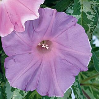 斑入りの葉。 花は赤、桃、茶、青紫にそれぞれ白い縁取りのある約10cmの花が多くつく。早咲きタイプ。つるは伸びにくい矮性種で支柱は不要。草丈低く鉢物向き。