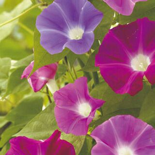 花の大きさは中大輪系です。大変丈夫な性質で、つるの伸びもよく作りやすい朝顔です。花色は空色や淡い桃色など、薄めの色彩も混じる混合品種です。