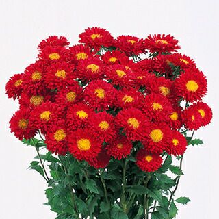 鮮やかな緋赤色。花径5cmほどで、暑い夏でも花もちがよく、お盆の花として人気の品種です。