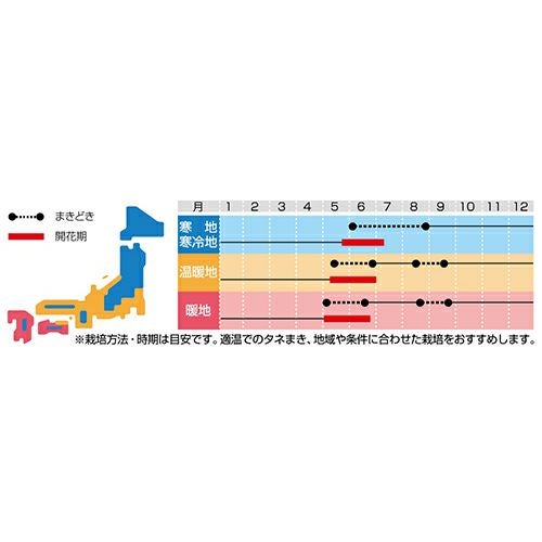 発芽温度:20℃前後 | 開花:(寒地)5月中旬~7月上旬、(中間地)5月中旬~6月、(暖地)春まき:6~7月、秋まき:5~6月 | 高さ:約80cm |