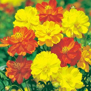 黄花コスモス(スルフレウス種)で、赤や黄、橙色の混合。暑さに強く真夏の花壇向き。