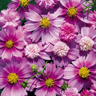 ポンポン八重咲き、アネモネ咲きと一重咲きのユニークなピンク系のミックス。