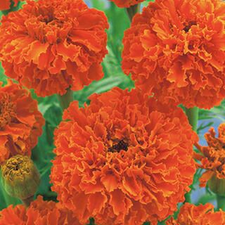 アフリカン系(万寿菊)は高性大輪で耐暑性があるのが特徴。土質を選ばず丈夫な性質で、夏~晩秋まで楽しめる。花の大きさは7~8cmで、花色は黄、橙黄、橙などがある。花びらをの重ねもよく、たくさんの花を咲かせる。キク科