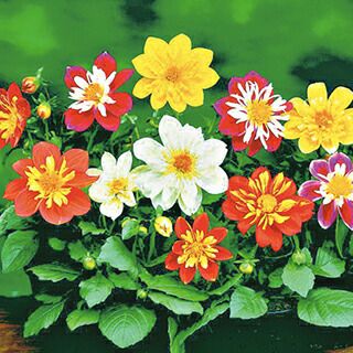 コラレット咲きでタネから育てるダリアの混合。ユニークな花形と多彩な花色を楽しめる。明るい花色で空間が華やぐタネから育てるダリア。苗作りも容易なのでいろいろな場所で利用でき、夏から秋まで長期間楽しめる。草丈低くて、寄せ植えにも使いやすい。キク科