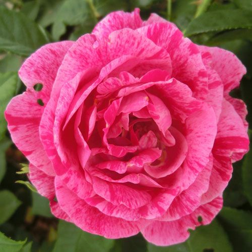 桃色に赤紫の絞りが入るオールドローズにしては珍しい花色で、明るい緑色の葉を生い茂らせる。ムスクの強い香りがする。