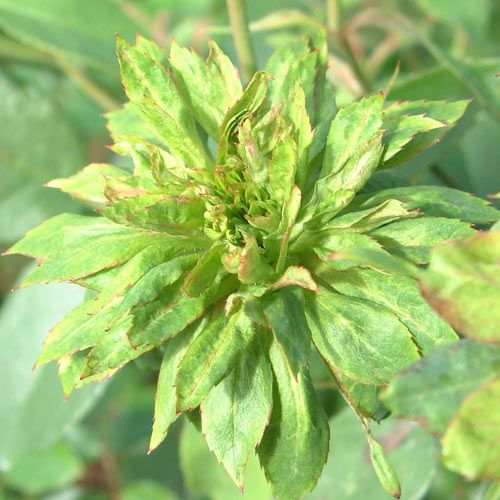 コウシンバラの変種で花弁の全てが葉になったので秋には、紅葉して赤く色付く。良く繁り大きな樹形になる。