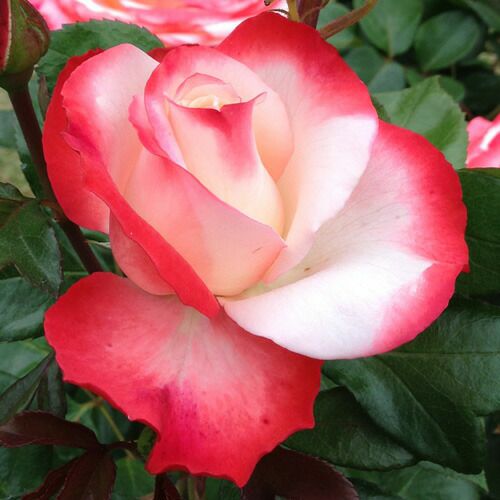 アイボリーホワイトに鮮やかな赤の覆輪で花色は独特に変化する。花保ちが大変良く開花につれて抱え咲きから平咲きに変化する。