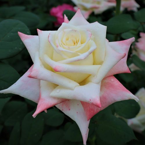 白に弁先に赤を帯びる。バラらしい豪華な花形の剣弁高芯咲。ほのかな香りが花の魅力を引き立てる。切り花としても楽しめる。