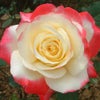 クリーム色に紅の覆輪。開くにつれて紅色が入り縁が波打つ。葉は半光沢でフルーティーな香り。