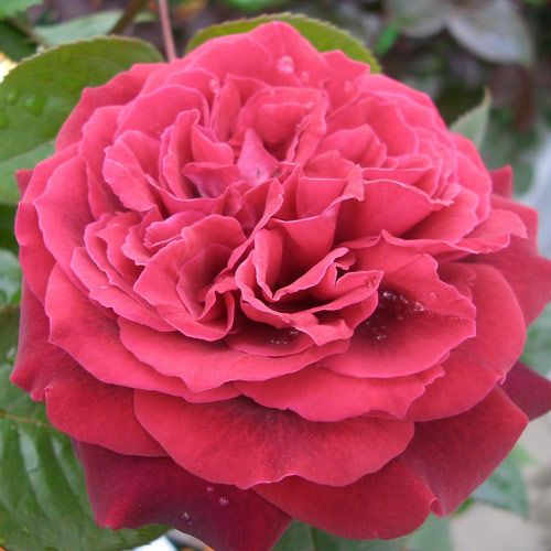 ビロードの濃い赤で気品がある花は、丸弁高芯咲きからロゼット咲きになる。花名はオランダの小さな古い村の地名。