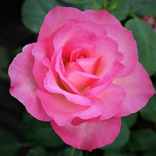 白地にピンクの覆輪で波打つ花弁に照葉がよく映える。花壇用シュラブローズだがシュートが長く伸びるためアーチにも最適。耐病性があり育て易い強健種。