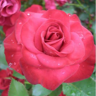 明るい赤で4~5輪の房咲きとなる。棘は赤く葉は濃緑から、とても賑やかな演出になる。