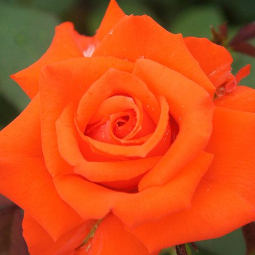 輝きのあるオレンジ色で、中輪としては存在感のある大きな花が咲く。葉の光沢がすばらしい。