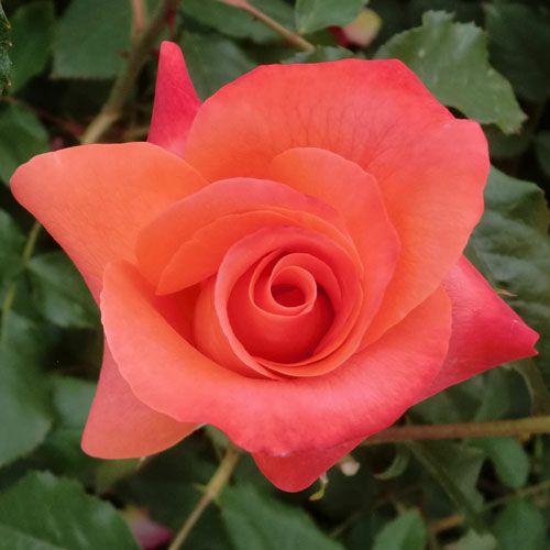 濃いオレンジで大きな房咲きの多花性。花つき花保ち共に良い。強健で育てやすい。株は全体に赤みが入る。上皇后美智子様に贈られたバラとして有名。