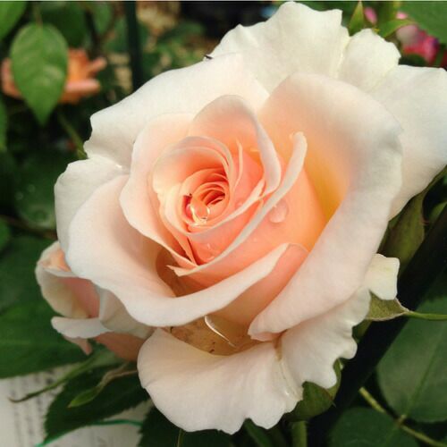 アプリコット色を含む淡桃色で、房咲き・多花性。青リンゴの様な心地良い香りがある。耐病性もあり初心者にも向く。