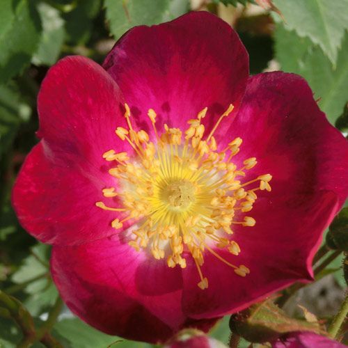 濃い紫の一重咲き。スパイシー系の程よい香りがある。耐病性・耐寒性があり冬に短く切り詰めて花を楽しめる。誘引がしやすいので、アーチやオベリスクに向く。