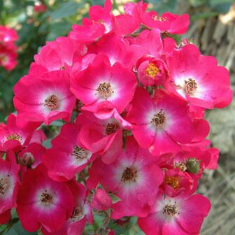 大きな房咲きになり、繊細でしなやかな枝を伸ばす。棘も少ないので誘引しやすい。葉は小さく濃い緑色で耐病性がある。秋には小さな実が楽しめる。