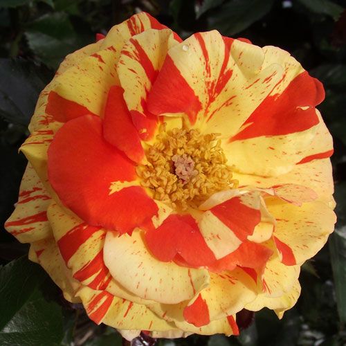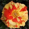 黄と赤の絞りで目を引く。房咲きの多花性である。海外では大輪系で栽培されているが、日本ではつる性としてよく伸びる。低いつるバラとして耐病性があり栽培しやすい。
