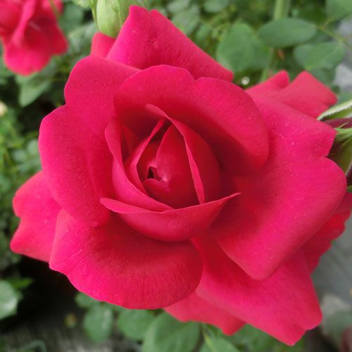 赤の大輪で半つる性になる。低く剪定すればブッシュ状に育てることもできる。