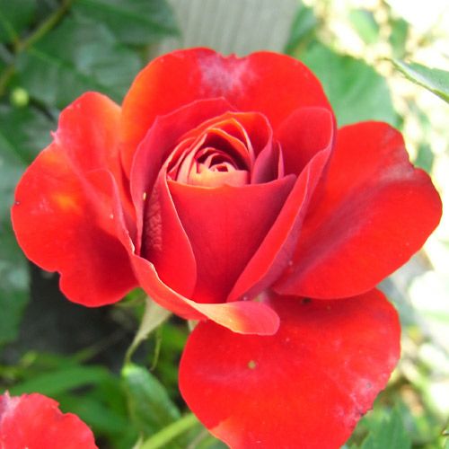 真赤な花が咲き誇り存在感が大きい。明るい赤で多花性の中大輪。光沢葉が素晴らしく花とのバランスが良い。