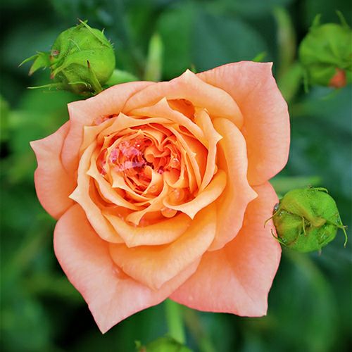 サーモンオレンジ色で咲くにつれてピンク色に変化をする。ミニチュアですがパティオローズとしても楽しめます。非常に房咲で、賑やかに咲きほこる。葉は光沢葉で、花を一層引き立てる。強健種。
