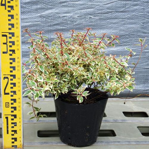 アベリアの斑入り品種で、秋には葉がピンクに紅葉するのが特徴です。花も初夏から秋にかけて小さな白花が咲きます。大変丈夫で育てやすいです。成長は遅めです。
